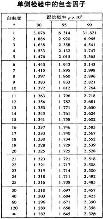 單側(cè)檢驗(yàn)與雙側(cè)檢驗(yàn)在合成標(biāo)準(zhǔn)不確定度評(píng)定中的方法相同,只是給出擴(kuò)展不確定度(p=95%)所乘的包含因子k95,與雙側(cè)檢驗(yàn)不同,即不是查本講座6.6中的t值表而是下表: