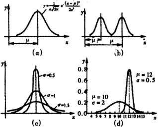 圖中示出了總體均值為μ,總體標(biāo)準(zhǔn)〔偏〕差為σ的正態(tài)分布的情形。由圖(c)可見,σ愈小,分布曲線愈集中或愈尖銳,表征測量結(jié)果或觀測值的分散性愈?。环粗?I>σ愈大,曲線愈平坦,表征分散性愈大。由圖(a)可見,分布曲線在x=μ處具有極大值,曲線不僅是單峰的,而且對(duì)x=μ直線來說是對(duì)稱的,在x=μ±σ處有兩個(gè)拐點(diǎn)。由圖(b)可見,分布的中心在x-μ處,μ值的大小決定了曲線在x軸上的位置,圖(d)對(duì)兩條不同μ值和不同σ值的正態(tài)分布曲線進(jìn)行了比較。