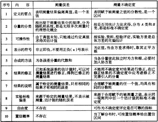歸納一下《通用計量術(shù)語及定義》5.16~5.20條以及5.9~5.14條的要點,可將測量誤差與測量不確定度之間存在的主要區(qū)別用下表簡示。