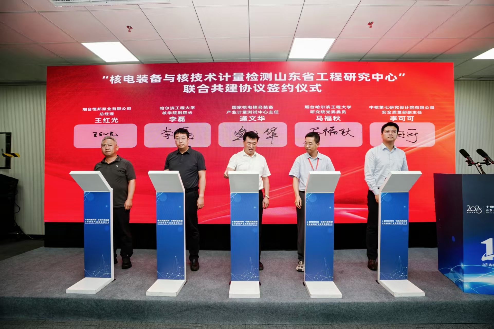 在合作簽約環(huán)節(jié),國家核電核島裝備產(chǎn)業(yè)計量測試中心主任逄文華、中核第七研究設(shè)計院有限公司安全質(zhì)量部副主任李可可、哈爾濱工程大學(xué)核學(xué)院副院長李磊、煙臺哈爾濱工程大學(xué)研究院黨委委員馬福秋教授、煙臺恒邦泵業(yè)有限公司總經(jīng)理王紅光共同簽署“核電裝備與核技術(shù)計量檢測山東省工程研究中心”聯(lián)合共建協(xié)議。此次聯(lián)合共建,匯聚了科研機構(gòu)、高校、企業(yè)等多方力量,將實現(xiàn)資源共享、優(yōu)勢互補,加速核電裝備與核技術(shù)計量檢測領(lǐng)域的技術(shù)突破與產(chǎn)業(yè)應(yīng)用,為工程研究中心的長遠發(fā)展提供有力保障。