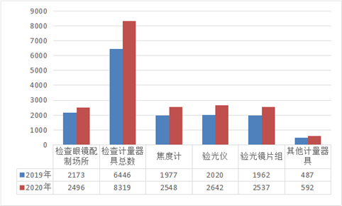全省共檢查眼鏡配制場所2496家,比2019年增加323家;檢查計量器具8319臺,比2019年增加1873臺;其中檢查焦度計2548臺、驗光儀2642臺、驗光鏡片組2537臺,其他計量器具592臺。