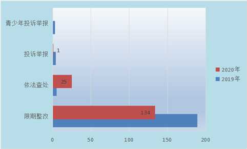 根據(jù)檢查中發(fā)現(xiàn)的問題,全省對134家眼鏡配制場所要求限期整改,比2019年減少了55家;全省對25家眼鏡配制場所進行了查處,比2019年增加了20家;全省處理眼鏡配制方面的投訴舉報1件,其中處理涉及兒童青少年投訴舉報0件,分別比2019年減少3件。