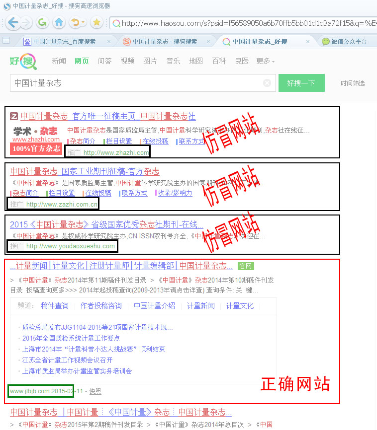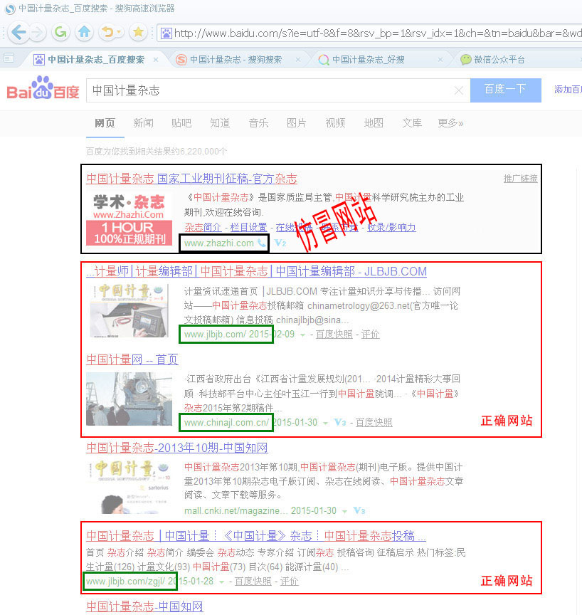 下面分別以百度、搜狗、好搜(360)分別搜索關(guān)鍵詞“中國計(jì)量雜志”為例,搜索結(jié)果如下(因搜索結(jié)果持續(xù)更新,結(jié)果可能會有不同或變化):