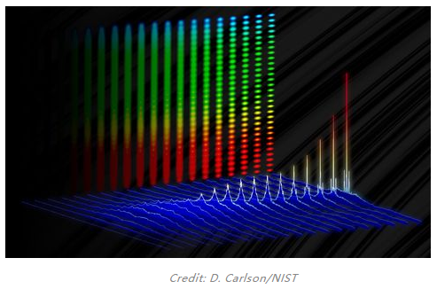 上圖顯示了NIST超快電光激光器中電子的背景噪聲(藍色)如何發(fā)出特定頻率或顏色的光(峰值)。垂直背景顯示了這些顏色如何組合形成光學頻率梳或光的“標尺”。