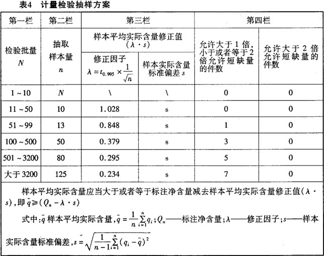 用抽樣的方法評定一個檢驗批的定量包裝商品,應當按照表4中的規(guī)定進行抽樣檢驗和計算。樣本中單件定量包裝商品的標注凈含量與其實際含量之差大于允許短缺量的件數(shù),并且樣本的平均實際含量應當符合表4的規(guī)定?!?br>