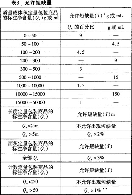 b.表3中相應增加了對以面積和計數(shù)標注的定量包裝商品凈含量允許短缺量的規(guī)定。