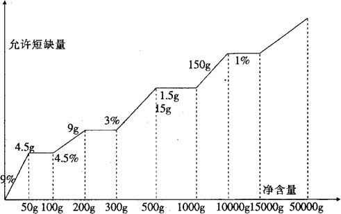 ?、谝再|量或體積標注凈含量商品的允許短缺量(表3),充分考慮了商品量的相對準確度和絕對準確度兩方面因素對定量包裝商品凈含量的影響。把允許短缺量按照標注凈含量的大小分為九段,每段與下段的允許短缺量之間是以百分比(相對誤差)和常數(shù)(絕對誤差)交替而有機地結合的形式出現(xiàn),各段的百分比和常數(shù)是不同的。標注凈含量越大,相對準確度越高,常數(shù)段的允許短缺量正好等于前段允許短缺量百分數(shù)的結束值,恰好也是后段允許短缺量百分數(shù)的開始值。如果把它畫成一條曲線,如圖2所示,允許短缺量表現(xiàn)為斜線與直線首尾相接的曲線,每段斜線的斜率是不同的。這種允許短缺量的形式是一種科學合理的方法,既保證了商品允許短缺量是以相對準確度為主劃分的特點,同時又考慮了絕對誤差對小商品量的決定性影響,克服了單純以相對準確度或絕對準確度劃分帶來的許多缺點。