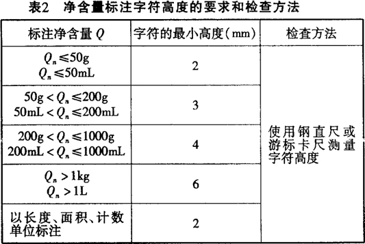 表2是對不同量限定量包裝商品標注凈含量所使用的字符尺寸的最小高度的規(guī)定,本規(guī)定與國際法制計量組織1997年版第79號國際建議《定量包裝商品標簽內(nèi)容》中的有關規(guī)定是一致的。