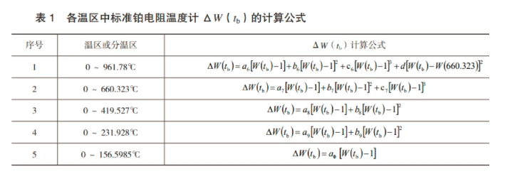 JJG1162-2019給出了采用標(biāo)準(zhǔn)鉑電阻溫度計作計量標(biāo)準(zhǔn)器時恒溫槽實(shí)際溫度tb的計算公式,其中JJG1162-2019的式(4)為最常用的0~419.527℃溫區(qū)的標(biāo)準(zhǔn)鉑電阻溫度計實(shí)測電阻比的差值函數(shù)值ΔW(tb)的計算公式。采用其他溫區(qū)標(biāo)準(zhǔn)鉑電阻溫度計作計量標(biāo)準(zhǔn)器時,應(yīng)采用相應(yīng)溫區(qū)的公式來計算ΔW(tb)值。標(biāo)準(zhǔn)鉑電阻溫度計在0~961.78℃溫區(qū)及各分溫區(qū)的ΔW(tb)計算公式如表1所示。表1中的a、b、c、d各項(xiàng)系數(shù)的值由標(biāo)準(zhǔn)鉑電阻溫度計的檢定證書獲得。