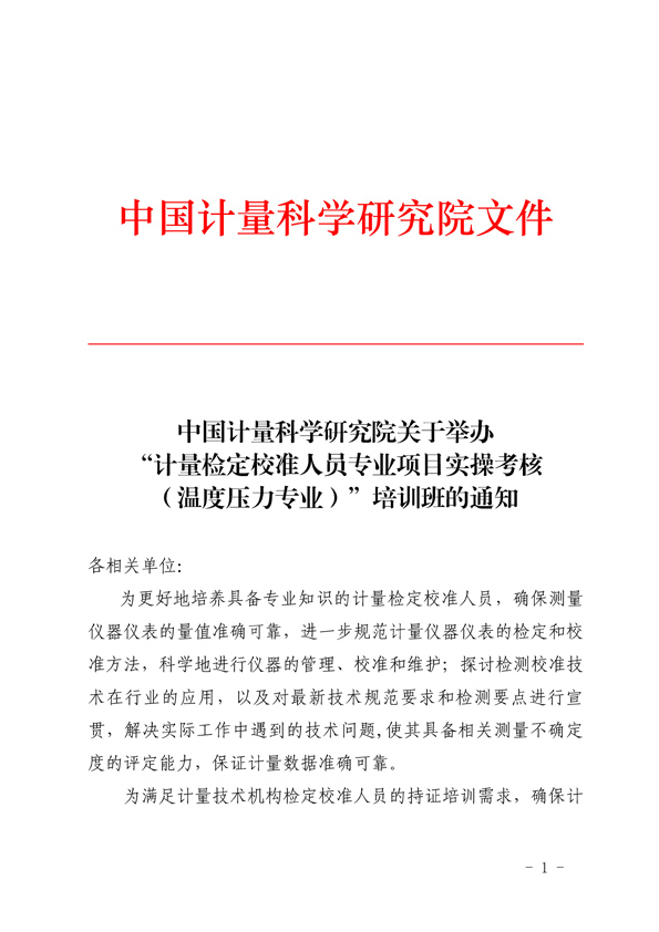 中國計(jì)量院關(guān)于舉辦“計(jì)量檢定校準(zhǔn)人員專業(yè)項(xiàng)目實(shí)操考核(溫度壓力專業(yè))”培訓(xùn)班的通知