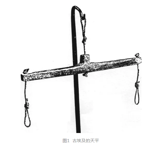目前所見世界上最早的稱重工具,是公元前2500年古埃及的天平(見圖1),它的支點(diǎn)在正中,稱重時(shí)當(dāng)重物與已知量相等時(shí),衡桿自然取平。對(duì)此,古人從日常生活積累的感性認(rèn)知上完全可以認(rèn)識(shí)到。因此早期制造天平,并非都一定要對(duì)力矩原理有所理解。這一點(diǎn)從中外早期的文字和符號(hào)上可以看到。