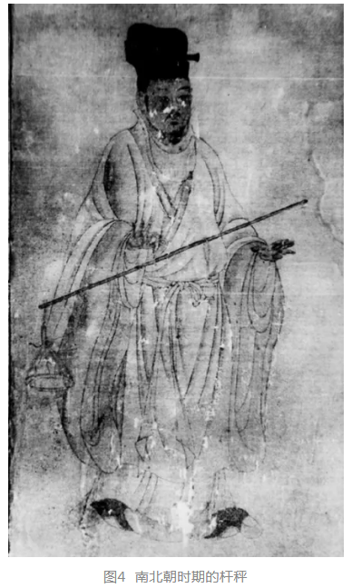 南朝著名畫家張僧繇(you)所畫二十八宿(xiu)神仙像之一的執(zhí)秤圖,給我們留下了早期桿秤的形象(見圖4);秤的一端系盤,秤紐僅略偏于盤的一邊,約占全桿的五分之二強(qiáng)。桿的臂比關(guān)系相差不大,由此看來(lái),秤砣與重物之比相差也不會(huì)很大。此外,敦煌莫高窟北魏壁畫《尸毗王本生圖》中掌秤者所執(zhí)之秤,支點(diǎn)的提紐也只是略偏于被稱物一邊。從這兩幅畫中也可以看出,在此期間,桿秤還沒有發(fā)展到很成熟的階段。