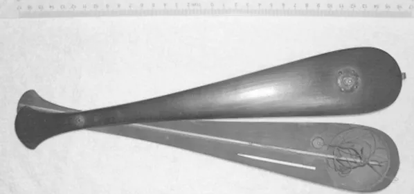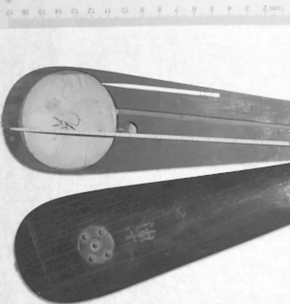 在我多年的收藏中就有幾桿這樣的線戥:盒為紅木質(zhì)地,桿為骨質(zhì)。以其中之一為例:桿長度達到31.7厘米,重量為2.27克,用游標(biāo)卡尺測量桿的直徑,大處只有2.25毫米,小處只有1.3毫米,非常纖細(xì),比普通牙簽略大(見下圖);上面是兩行刻度,頭紐稱量范圍是1錢至1兩,二紐稱量范圍是0至1錢。盤為厚0.25毫米的黃銅質(zhì),直徑5厘米,重5.1克。砣是一個直徑0.94厘米、高0.83厘米的小圓柱體,經(jīng)檢測重量為4.55克,折合清代計量標(biāo)準(zhǔn)為1錢2分,為非定量砣。盒的銅扣件采取了非常巧妙的暗推倒鉤結(jié)構(gòu),設(shè)計十分完美實用,以至于在數(shù)百年后的今天還能輕松開啟。