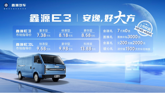鑫源E3作為“安逸,好大方”全新車型,共推出鑫源E3、鑫源E3L兩個車型,分別有基礎(chǔ)型、標準型、豪華型、科技型等6款配置,指導(dǎo)價7.38萬元-13.88萬元。上市還推出新車上市權(quán)益包:1、金融禮-7萬真0息;2、置換禮-置換補貼3000元;3、金喜禮-交200抵2000元;4、暖心禮-送價值1500元全車鋁地板。鑫源E3以“一寸長·一寸強”、“移動家·頭等艙”和“好·省”三大核心賣點,為新能源城配物流樹立新標桿!