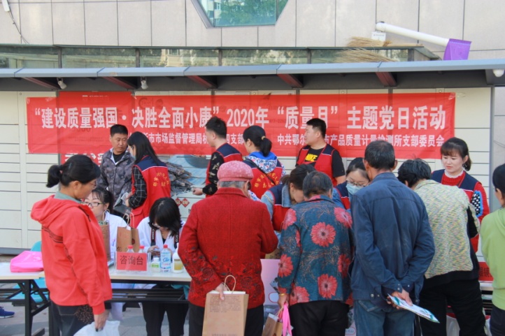 二是開展相關(guān)主題黨日活動。9月24日,市質(zhì)計所黨支部帶領(lǐng)黨員同志和專業(yè)技術(shù)人員到康巴什珠江社區(qū)開展“建設(shè)質(zhì)量強國 決勝全面小康”2020年“質(zhì)量月”主題黨日活動。活動設(shè)立了咨詢臺、眼鏡檢測臺、血壓計檢測臺、人體秤檢測臺等,為居民開展了檢驗檢測現(xiàn)場服務(wù)和咨詢,并發(fā)放了民用計量器具知識、計量保障質(zhì)量知識宣傳冊和小紀(jì)念品共計300余份,營造了追求質(zhì)量、關(guān)注質(zhì)量的良好氛圍。