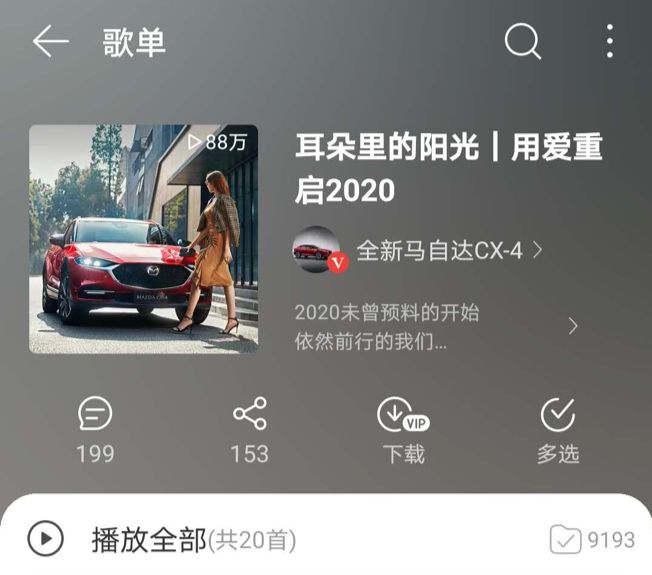 除了發(fā)起#易起許愿101#微博話題外,一汽馬自達還聯(lián)合網(wǎng)易云音樂客戶端以及平臺人氣音樂人,共同定制#耳朵里的陽光丨用愛重啟2020#主題歌單,讓大家在音樂的力量中去感受積極向上的溫暖正能量。該歌單僅在上線一周的時間里,就獲得88萬次播放以及9193位用戶收藏認可,并被多位人氣音樂人在微博同步轉發(fā)歌單,以愛傳遞并肩前行的力量。