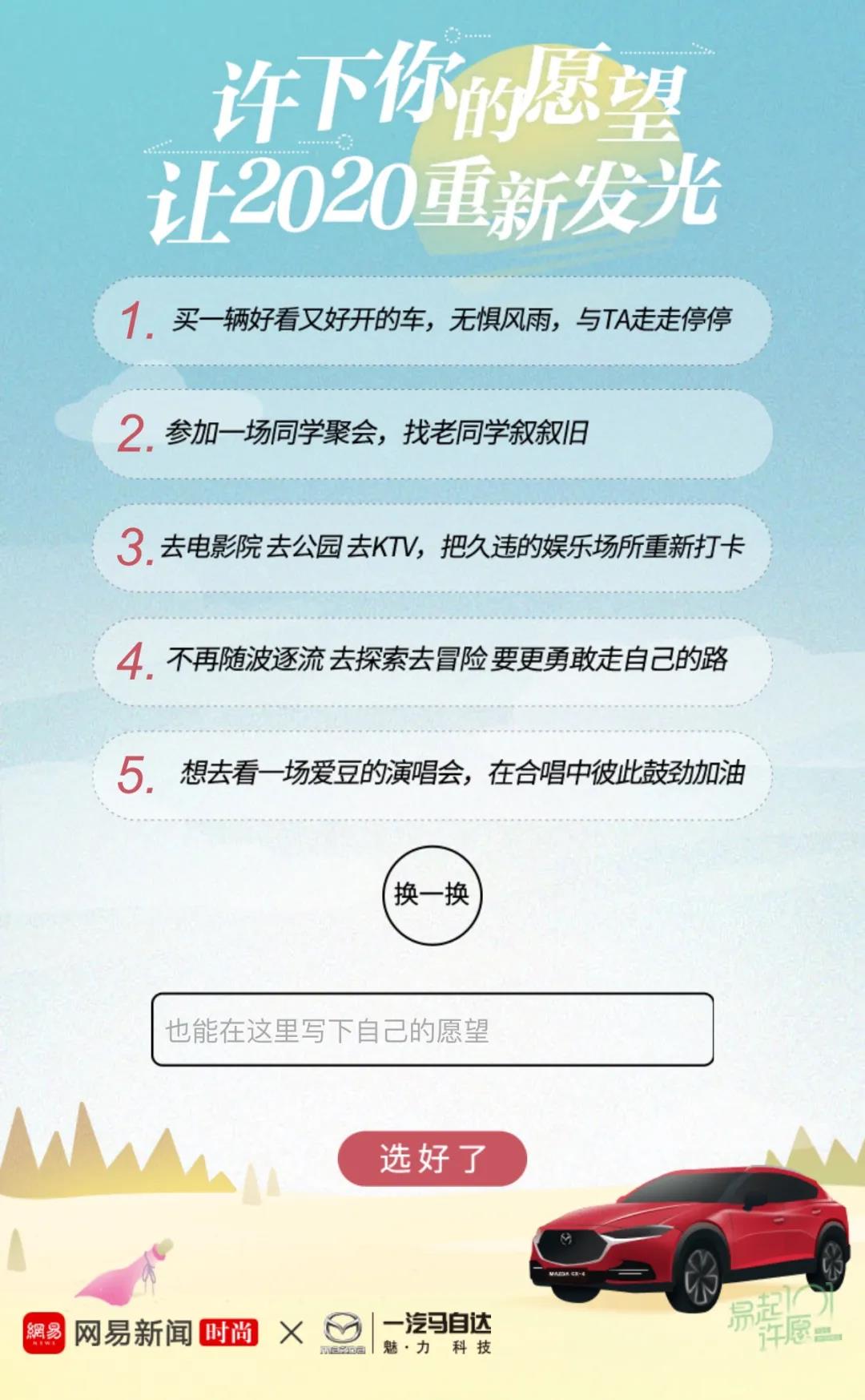 為了進一步引導公眾情緒抒發(fā),一汽馬自達還聯(lián)合網(wǎng)易新聞客戶端時尚頻道設計制作了互動H5——#許下自己的愿望 讓2020重新發(fā)光#。30條可選擇的愿望清單文案,看似簡單,但卻是經(jīng)過了精心設計。其中,既有像“不再做‘光想’青年,全力奔跑,每天都做更出色的自己”這樣的勵志愿望,也有像“想去看一場自己支持的隊伍的比賽”這樣的樸實心愿,以非常接地氣的形式戳中大眾心底的思緒。該H5很快便在微信、微博獲得了廣泛傳播,參與互動許愿生成個人海報的人數(shù)已逾百萬。