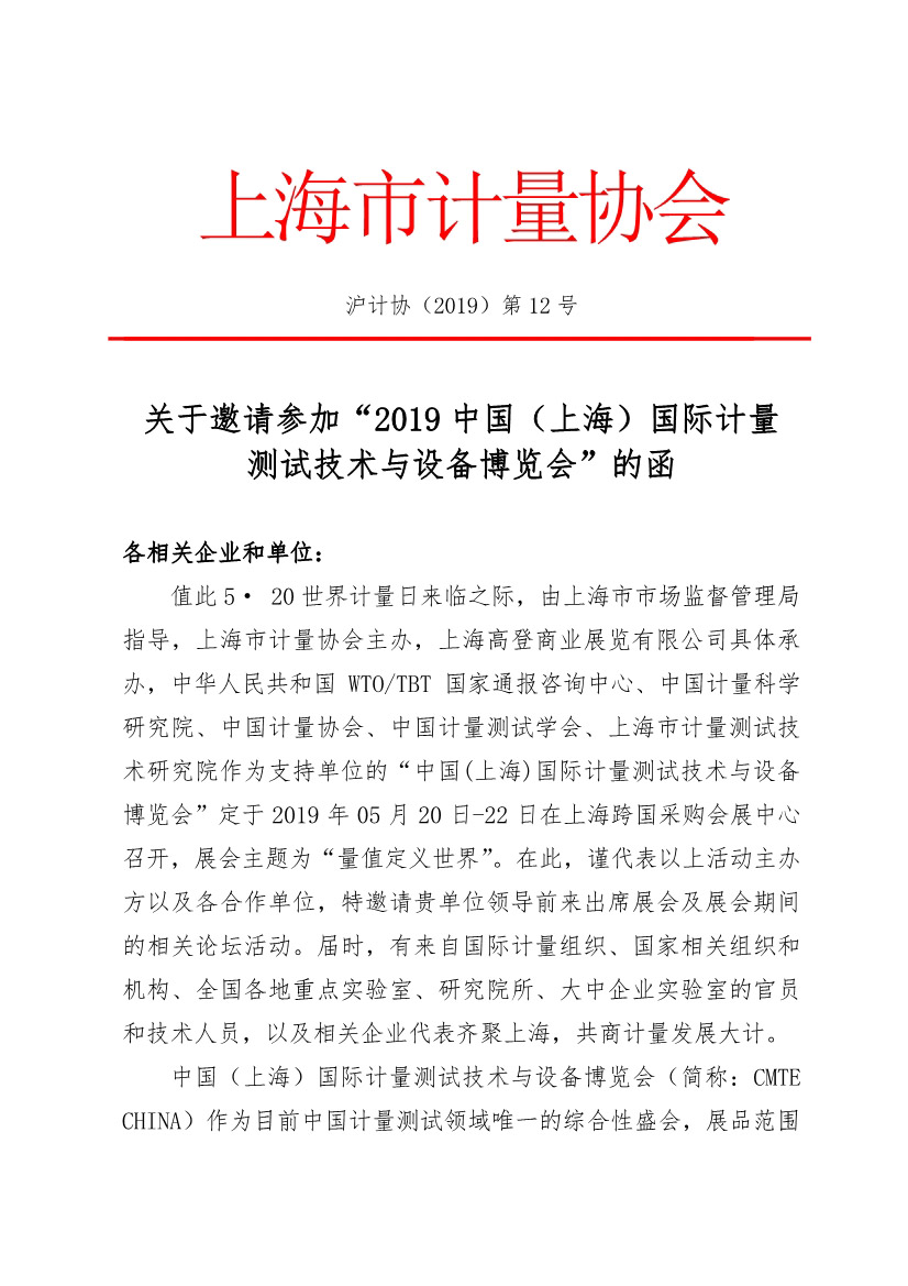 關(guān)于邀請(qǐng)參加“ 2019 中國(guó)(上海)國(guó)際計(jì)量測(cè)試技術(shù)與設(shè)備博覽會(huì)”的函