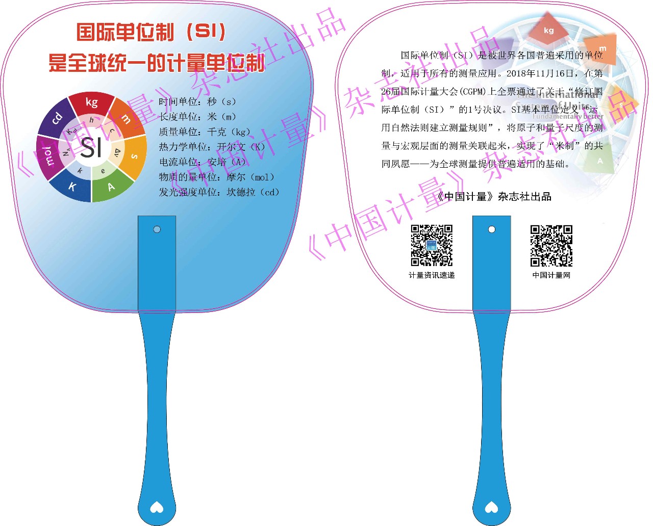 “520世界計(jì)量日”主題宣傳畫(huà)一套2張(一張國(guó)際版,一張國(guó)內(nèi)版),規(guī)格為570mm×840mm;配套折頁(yè)(兩張“圖說(shuō)計(jì)量單位制”,八張“圖說(shuō)國(guó)際單位制”),三折頁(yè)展開(kāi)規(guī)格為210mm×285mm(16開(kāi))。計(jì)量宣傳扇(宣傳七個(gè)計(jì)量基本單位)。