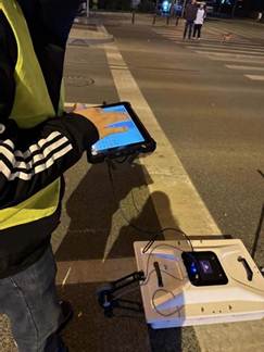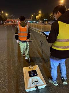 夜晚時分,課題組攜帶課題產(chǎn)品探地雷達抵達一處有潛在空洞風(fēng)險區(qū)域進行地下空洞識別及燃氣管線地下風(fēng)險排查工作,夜晚氣溫驟降,且有來來往往行駛的車輛,課題組在保障全員安全的前提下,克服困難順利完成空洞檢測,通過數(shù)據(jù)深度分析,找到兩處疑似脫空病害,為后續(xù)風(fēng)險排查提供數(shù)據(jù)依據(jù)。