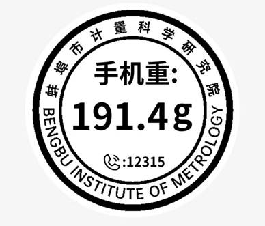 一是精心設計,標簽醒目。蚌埠計量院“手機變砝碼”克重標簽為圓形,內(nèi)外雙環(huán),外環(huán)為蚌埠計量院全稱,彰顯手機克重檢定來源;內(nèi)環(huán)大號字體顯示手機精準克重,正下方備注消費者投訴舉報專線電話“12315”,方便消費者使用。