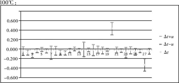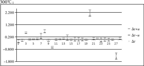 從圖4、圖5中可看出,300℃點的比對結(jié)果很不滿意,合格率非常低。造成300℃檢定點測量結(jié)果不滿意的主要原因有以下三點: