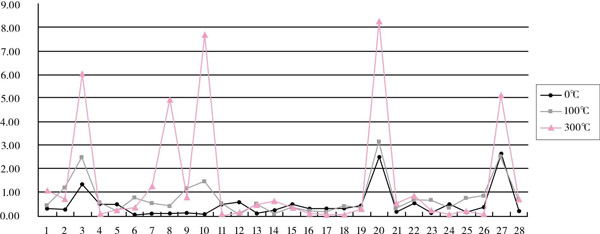 選擇0℃、100℃和300℃作為比對點。