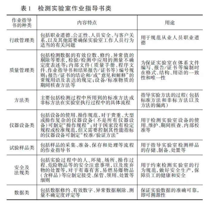 作業(yè)指導(dǎo)書(shū)是“有關(guān)任務(wù)如何實(shí)施和記錄的詳細(xì)描述”,是用來(lái)指導(dǎo)檢測(cè)實(shí)驗(yàn)室具體運(yùn)轉(zhuǎn)過(guò)程,形成的具體的技術(shù)性強(qiáng)且可操作的文件形式,檢測(cè)實(shí)驗(yàn)室的作業(yè)指導(dǎo)書(shū)一般應(yīng)具有合理性、記錄詳細(xì)、簡(jiǎn)單明了、可操作性強(qiáng)等特點(diǎn),同時(shí)作業(yè)指導(dǎo)書(shū)也需要在影響檢測(cè)過(guò)程的每一個(gè)環(huán)節(jié)制定。結(jié)合以上特性,檢測(cè)實(shí)驗(yàn)室所編寫(xiě)的作業(yè)指導(dǎo)書(shū)應(yīng)當(dāng)包括以下幾種(見(jiàn)表1)。