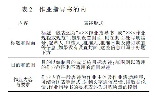 作業(yè)指導(dǎo)書(shū)一般不采用統(tǒng)一的格式和結(jié)構(gòu),但在同一種組織體系內(nèi)為保持一致性,通常采用同樣的格式和結(jié)構(gòu)。但無(wú)論何種格式或組合,作業(yè)指導(dǎo)書(shū)編寫(xiě)內(nèi)容與作業(yè)活動(dòng)的順序相一致,必須如實(shí)準(zhǔn)確地反映作業(yè)要求及相關(guān)內(nèi)容。同時(shí)內(nèi)容應(yīng)適合檢測(cè)或單位其他人員使用,并符合作業(yè)指導(dǎo)書(shū)所表述的生產(chǎn)或管理活動(dòng)的復(fù)雜程度以及使用人員的技術(shù)水平及技能資質(zhì)和資格等。作業(yè)指導(dǎo)書(shū)的內(nèi)容一般包括以下幾部分(見(jiàn)表2)。