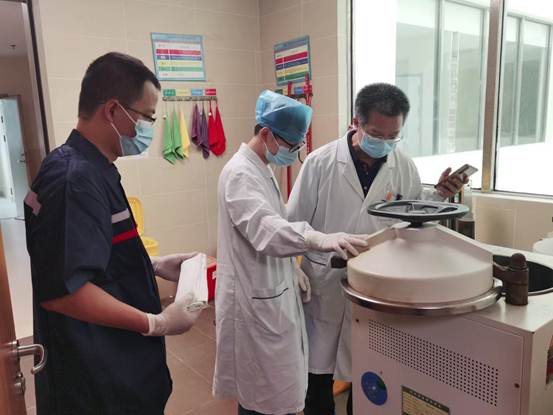 梧州市計量所黨員干部在醫(yī)院現(xiàn)場檢測抗疫儀器設(shè)備