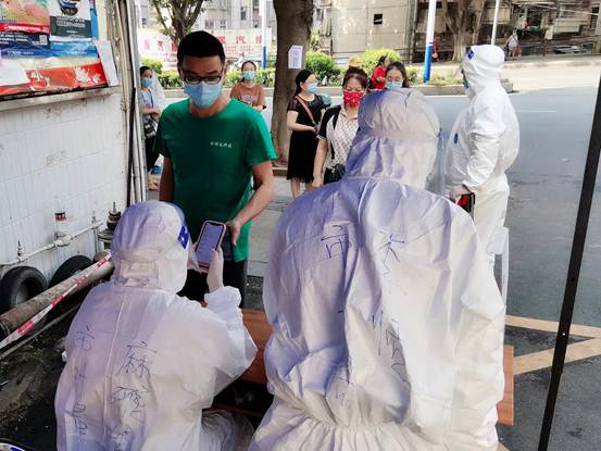 在抗疫過程中梧州市計量所黨員干部積極請戰(zhàn),主動投身疫情防控志愿者行動,協(xié)助社區(qū)、醫(yī)護人員開展疫情防控工作?!澳?,我已經(jīng)幫您測量了體溫,您要提前打開智桂通的健康碼,顯示綠碼后才能進行核酸采集”、“大家要有序排隊,保持一米安全距離,不要擁擠”、“您好,請您提前打開核酸碼,方便等下信息錄入,如果您沒有核酸碼,現(xiàn)在可以提前進行信息錄入”這些重復(fù)的話語志愿者們每天都不厭其煩的表達著。在核酸檢測過程中,他們不僅僅只做信息錄入員,而是積極充當(dāng)居民群眾的“引導(dǎo)員”、防疫政策的“宣講員”,矛盾問題的“疏導(dǎo)員”,確保服務(wù)全覆蓋、核酸檢測無遺漏。一個志愿服務(wù)組織就是一座堡壘,一名志愿者就是一面旗幟,梧州市計量測試所的黨員干部們用實際行動踐行初心使命,以奉獻詮釋責(zé)任擔(dān)當(dāng),讓黨旗在疫情防控第一線高高飄揚。