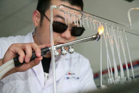 手穩(wěn)不穩(wěn),直接影響玻璃的均勻度。稍有不慎,玻璃焊接出來就是彎曲的,甚至導(dǎo)致銣泡破裂。為了提高成品率和質(zhì)量,張文沖就拿根玻璃管,反復(fù)練習(xí)焊接,這樣一練就練了半年,光是玻璃管就用了好幾袋子,正是這樣反復(fù)的練習(xí),練就了一手準(zhǔn)的“絕活”。一眨眼的工夫就將兩根玻璃管準(zhǔn)確無誤對(duì)接上,因?yàn)樗钪坏┎鸾?,就意味著廢了,意味著產(chǎn)品成本。