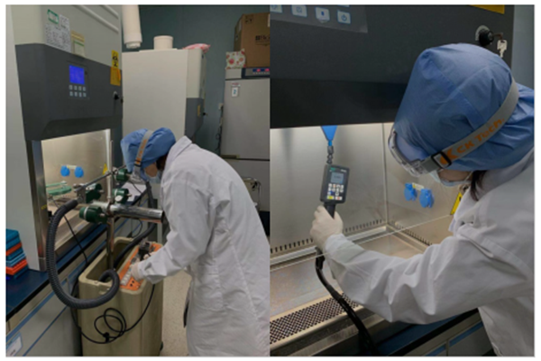 鑒于武漢某新型冠狀病毒肺炎定點醫(yī)院檢驗科的檢驗師們只做化驗和測試卻有4位受感染的前車之鑒,廣醫(yī)二院高度重視所用Ⅱ級生物安全柜的安全性和可靠性,向廣州計量院提出加急檢測需求。廣州計量院堅決貫徹習近平總書記“堅持把人民群眾生命安全和身體健康放在第一位”的重要指示,不畏危險,迎難而上,緊急調派精干技術力量迅速響應檢測需求,奔赴現(xiàn)場對生物安全柜進行全面檢測,有效防止高效過濾器完整性、人員保護、產品保護、交叉污染保護等核心指標不符合要求的設備投入使用,為保障新型冠狀病毒化驗測試結果可靠、防止病毒等污染材料外泄、保護檢驗檢疫人員健康提供有力的計量技術支撐。