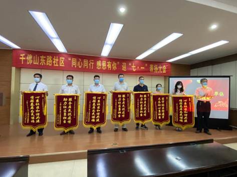 6月29日,濟(jì)南市歷下區(qū)千佛山東路社區(qū)黨委組織開展“同心同行 感恩有你”迎“七一”表揚(yáng)大會(huì),山東省計(jì)量科學(xué)研究院被評(píng)為“千佛山東路社區(qū)抗疫模范先進(jìn)單位”并獲得“服務(wù)居民抗疫情 助力社區(qū)勇?lián)?dāng)”榮譽(yù)錦旗。
