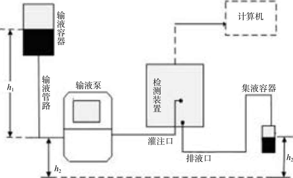 按照J(rèn)JF1259-2018,在進(jìn)行計(jì)量校準(zhǔn)時(shí)采用的是體積流量輸注泵,單位為mL/h。醫(yī)用輸注泵的流量校準(zhǔn)采用比對法,通常使用醫(yī)用注射泵和輸液泵檢測儀(以下簡稱“檢測儀”)進(jìn)行校準(zhǔn)。以輸液泵的校準(zhǔn)為例,原理圖如下: