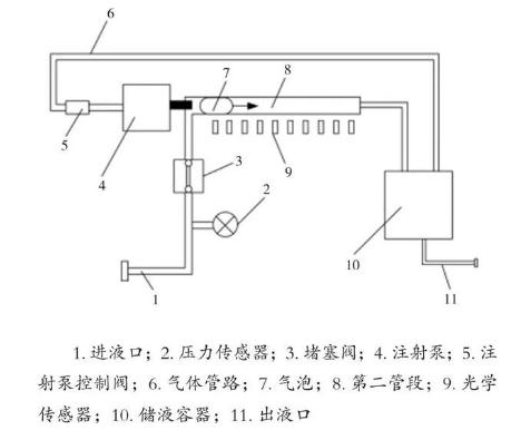 儲液容器10構造為回收測試液體,一般來說,測試液體可以為水或者經染色劑染色而便于觀測的溶液。第一管段具有一進液口,其上設置有用于測量管路內測試液體的壓力的壓力傳感器2,第二管段為透光管路(例如玻璃材質的管路)且外側設置有光學傳感器9,儲液容器10設置有一出液口。注射泵4的輸出端連接至第二管段8,且其輸入端通過一氣體管路6連接至儲液容器10。在一些實施案例中,如圖1所示,可以在氣體管路6上增設注射泵控制閥5,并且為了便于精確測量,設置在第二管路8外側的光學傳感器 9也可以并列且等距設置有多個。