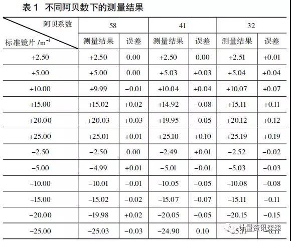 比對數(shù)據(jù)表明,在其他條件相同的情況下,選擇不同 的阿貝數(shù)設(shè)置,所得到的頂焦度示值誤差相差很大,表明阿貝數(shù)設(shè)置對頂焦度測量結(jié)果的影響的確較大,并且屈光度數(shù)越高,影響也越明顯。事實(shí)證明:如果檢定人員在檢定前沒有正確調(diào)整和設(shè)置標(biāo)準(zhǔn)焦度計(jì)的阿貝數(shù),就可能因頂焦度示值誤差較大而導(dǎo)致發(fā)生對驗(yàn)光鏡片箱檢定結(jié)果的誤判。