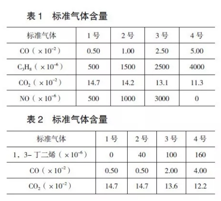 為了保證遙測數(shù)據(jù)的準確性,在設(shè)備投入工作前,應(yīng)對設(shè)備進行校準。設(shè)備校準氣體的濃度一般選取超標(biāo)限值附近,以保證檢測在超標(biāo)限值附近的氣體有更高的準確度。常用的遙測設(shè)備根據(jù)工作原理不同分為非分散紅外和近紅外激光兩種,兩種設(shè)備HC氣體檢測的成分不同。非分散紅外設(shè)備氣體檢測組分是CO、CO2、NO和C3H8,近紅外激光設(shè)備氣體檢測組分是CO、CO2、NO和1,3丁二烯。非分散紅外設(shè)備采用如表1所示氣體校準,近紅外激光遙測設(shè)備可采用表1和表2中氣體校準。另外,利用中紅外激光技術(shù)檢測C3H8的遙測設(shè)備可采用表1中的氣體校準。