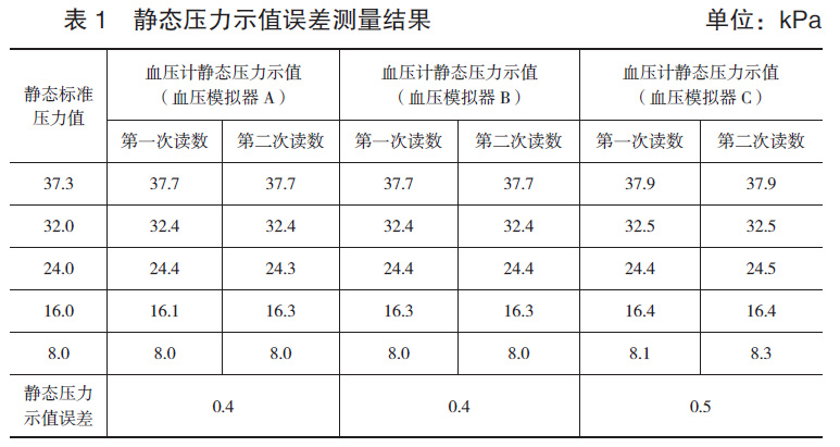 使用該型號電子血壓計的靜態(tài)壓力測量專用接頭,用膠管和三通把電子血壓計與金屬容器、標(biāo)準(zhǔn)器連接起來組成檢定系統(tǒng)。將電子血壓計調(diào)至靜態(tài)壓力測試模式,在電子血壓計規(guī)定的靜態(tài)壓力范圍內(nèi),標(biāo)準(zhǔn)器設(shè)定5個檢定點,由標(biāo)準(zhǔn)器對電子血壓計逐點從高到低降壓,重復(fù)進行2次壓力測量,測量結(jié)果如表1所示。