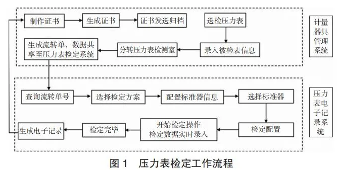 設計形成的電子記錄系統(tǒng)(以下簡稱“壓力表電子記錄系統(tǒng)”)需符合計量檢定規(guī)程要求,具有實時檢定、實時記錄、自動進行數(shù)據(jù)處理、證書制作、界面友好等特點,并可與當前北京市使用的計量器具管理系統(tǒng)實現(xiàn)數(shù)據(jù)共享。鑒于此,通過探索,本系統(tǒng)以具有數(shù)據(jù)實時記錄和符合壓力表計量檢定規(guī)程功能特點的 ACal 壓力檢定 / 校準系統(tǒng)為基礎進行設計,根據(jù)壓力表強制檢定工作流程,將我單位在用計量標準器的相應參數(shù)、模板等數(shù)據(jù)導入該系統(tǒng),通過調(diào)整和測試,確保原始數(shù)據(jù)的記錄和處理符合國家計量檢定規(guī)程,實現(xiàn)壓力表檢定過程中檢測數(shù)據(jù)的實時記錄,形成電子記錄檔案,并通過計算機技術與北京市使用的計量器具管理系統(tǒng)進行關聯(lián),形成了一套完整的壓力表檢定電子數(shù)據(jù)檔案 , 具體流程如圖 1 所示。