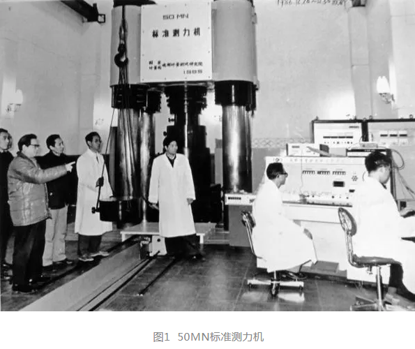1978年起,我開始承擔(dān)“20MN(2000噸力)液壓式基準(zhǔn)測力機”課題組長,到1981年才落實承制廠。1977年起,計量分院著手研制力源式50MN(5000噸力)標(biāo)準(zhǔn)測力機。同年5月,我與計量分院何文炫在上海調(diào)查大力源,即2000~5000噸力油壓機。因為50MN標(biāo)準(zhǔn)測力機的基礎(chǔ)就是5000噸力油壓機。1979年4月,我在成都參加了計量分院召開的第一次“5000噸力力源方案”討論會。1981年6月我參加了計量分院在桂林召開的第二次“5000噸力力源方案討論會”,大家一致認為2000噸力以上采用力源式來建立標(biāo)準(zhǔn)測力機是正確的選擇。1986年下半年,5000噸力標(biāo)準(zhǔn)測力機研制成功,同年12月下旬,我主持了“50MN標(biāo)準(zhǔn)測力機鑒定會”,這臺測力機安裝在計量分院大邑基地(見圖1)。