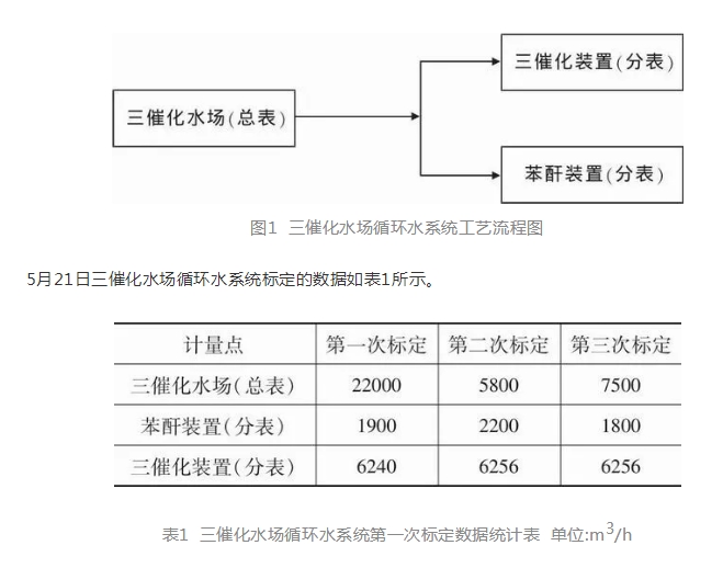 還是以新氣分水場循環(huán)水系統(tǒng)為例,在9月5日對異丙醇裝置的分表進(jìn)行移位檢修后,用便攜式超聲波流量計(jì)對其進(jìn)行了單點(diǎn)的在線標(biāo)定,標(biāo)定數(shù)據(jù)為1500m3/h(正常值應(yīng)該為2200m3/h左右)。維修人員以此為依據(jù)調(diào)整流量計(jì),結(jié)果導(dǎo)致生產(chǎn)車間操作失誤。如果當(dāng)時采取系統(tǒng)標(biāo)定的方法,對整個系統(tǒng)的總表與分表進(jìn)行整體標(biāo)定,便會及時發(fā)現(xiàn)問題,從而避免流量計(jì)指示正確的“偽數(shù)”。