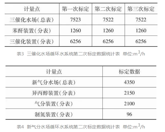 從以上的數(shù)據(jù)和實(shí)例可以看出,雖然這只是個別現(xiàn)象,但如果出現(xiàn)在關(guān)鍵數(shù)據(jù)上,會給生產(chǎn)帶來極大的隱患,甚至?xí)霈F(xiàn)安全事故,節(jié)能減排降耗更無從談起。還是以上述新氣分水場循環(huán)水系統(tǒng)為例,在發(fā)現(xiàn)標(biāo)定數(shù)據(jù)有誤后,通過查找原因,我們認(rèn)為是管道襯里和管壁結(jié)垢造成的輸入管徑數(shù)據(jù)有誤,導(dǎo)致檢測數(shù)據(jù)失準(zhǔn)(這在后期的檢修并對管線內(nèi)部查看時,證實(shí)了這一點(diǎn))。這樣我們及時地調(diào)整了標(biāo)定的位置,并配以超聲波測厚儀,在管線上尋找最佳標(biāo)定位置。下面是調(diào)整了標(biāo)定位置后標(biāo)定的數(shù)據(jù)(見表3和表4)。