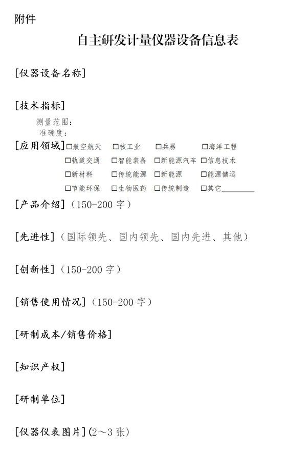 《通知》要求各單位全面梳理“十三五”期間自主研發(fā)的計量儀器儀表、計量測試裝備和計量基標準裝置,并填報“自主研發(fā)計量儀器設備信息表”(見附件),于2021年4月30日前報送市場監(jiān)管總局計量司。報送的儀器設備必須由本單位自主研制,或者以本單位為主聯合其它單位共同研制。既可以是已經研制、生產并在市場銷售的,也可以是研制成功但尚未大規(guī)模生產,僅在實驗室內部使用的首臺套。對具有技術成果鑒定或論證報告的,可予以優(yōu)先報送。報送郵箱為:Email:huangchen@samr.gov.cn