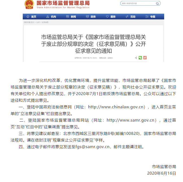 近日,市場監(jiān)管總局發(fā)布通知,為進(jìn)一步深化機(jī)構(gòu)改革,優(yōu)化營商環(huán)境,提升監(jiān)管效能,市場監(jiān)管總局起草了《國家市場監(jiān)督管理總局關(guān)于廢止部分規(guī)章的決定(征求意見稿)》,現(xiàn)向社會(huì)公開征求意見。征求意見的截止日期為2020年7月1日。其中涉及兩部計(jì)量規(guī)章:《社會(huì)公正計(jì)量行(站)監(jiān)督管理辦法》,《計(jì)量檢定人員管理辦法》