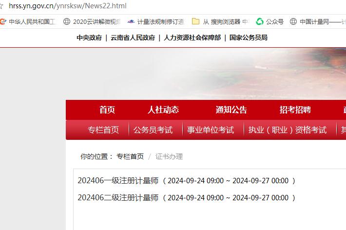 從云南省人力資源和社會保障廳人事考試專欄(http://hrss.yn.gov.cn/ynrsksw/News22.html)獲悉,該省2024年度注冊計量師職業(yè)資格證書也已開始辦理,顯示辦理時間為2024年9月24日-27日。